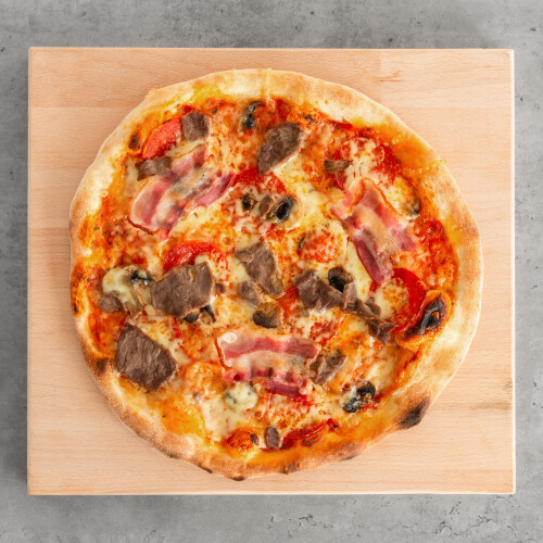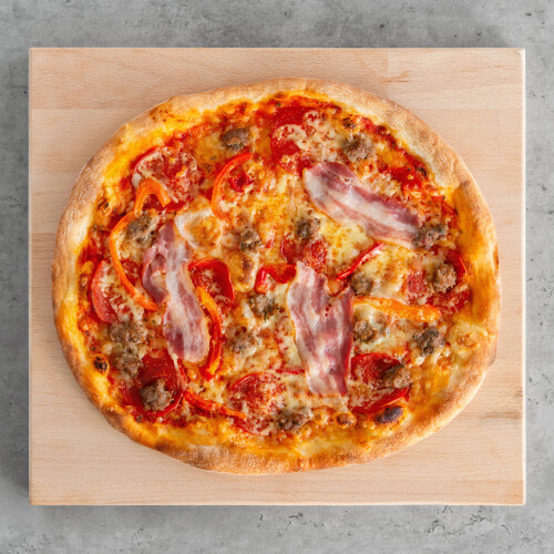 Oksekød, pepperoni, bacon, peberfrugt, chili og hvidløg