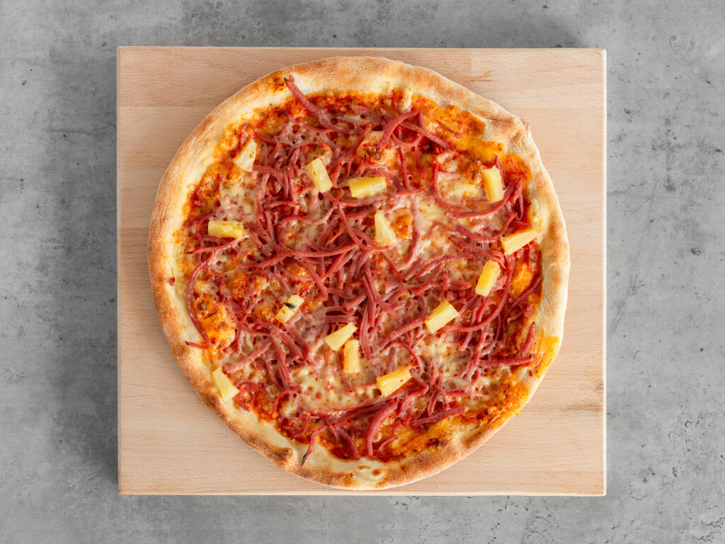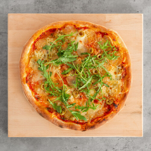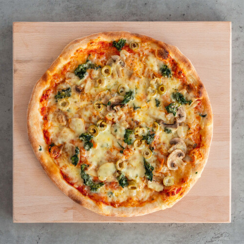 Champignon, ananas, oliven, peberfrugt, løg, majs og fetaost